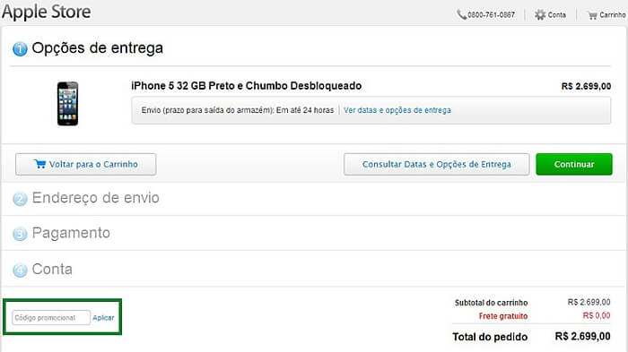 O próximo passo para prosseguir com seu pedido é “opções de entrega”. Se você tiver código promocional, aplique aqui: