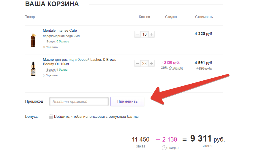 На сайте Интернет-магазина «Randewoo» добавьте товар в корзину. Перейдите в корзину. Там вы первым делом увидите поле для промокода, выглядит оно вот так: