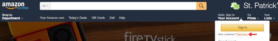 เข้าไปยัง www.amazon.com จะเห็นเมนูด้านซ้ายบนที่เขียนว่า Hello, Sign in ให้คลิกที่คำว่า Start Here
